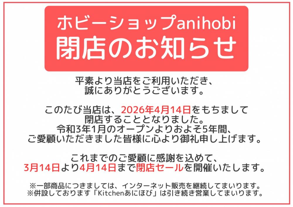 ホビーショップanihobiは2021年1月より約5年間、アニメグッズ、フィギュアなどを販売して参りましたが、4月14日をもちまして閉店させていただくこととなりました。