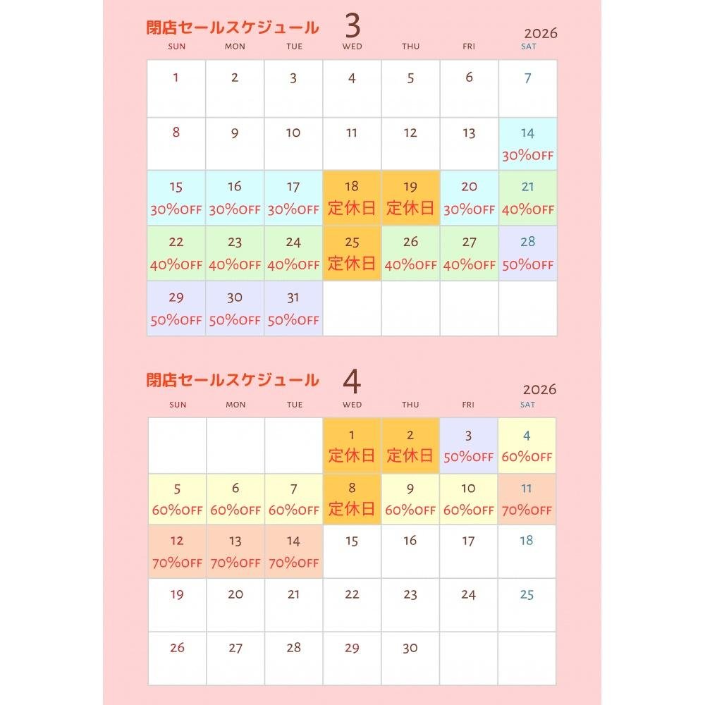 閉店セール期間中、3/18、19、25、4/1、2、8は休業日となります。